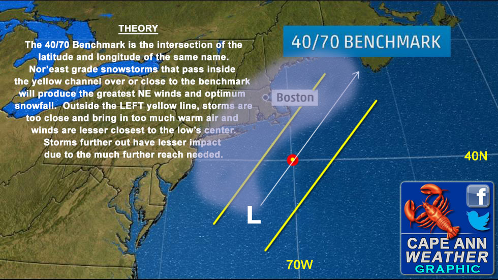 Benchmark (See Map below) - When nor'easters travel NE or NNE over or very near the